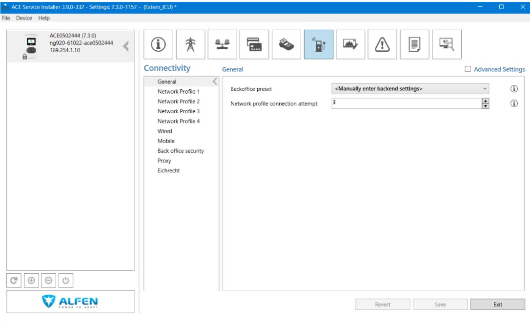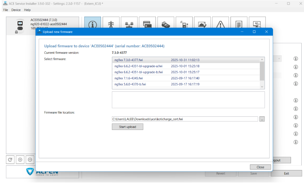 (*) Jos tässä kohtaa tulee virhe “unable to communicate with the charger”, käynnistä sekä tietokone että latausasema uudestaan. Kun kirjaudut sisään uudelleen, vaihda “Backoffice preset” asetus muotoon “Standalone” ja päivitä ohjelmisto. Kun ohjelmisto on päivitetty, vaihda se takaisin muotoon “Manually enter backend setting”.